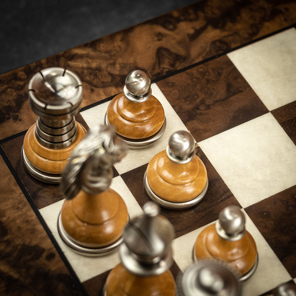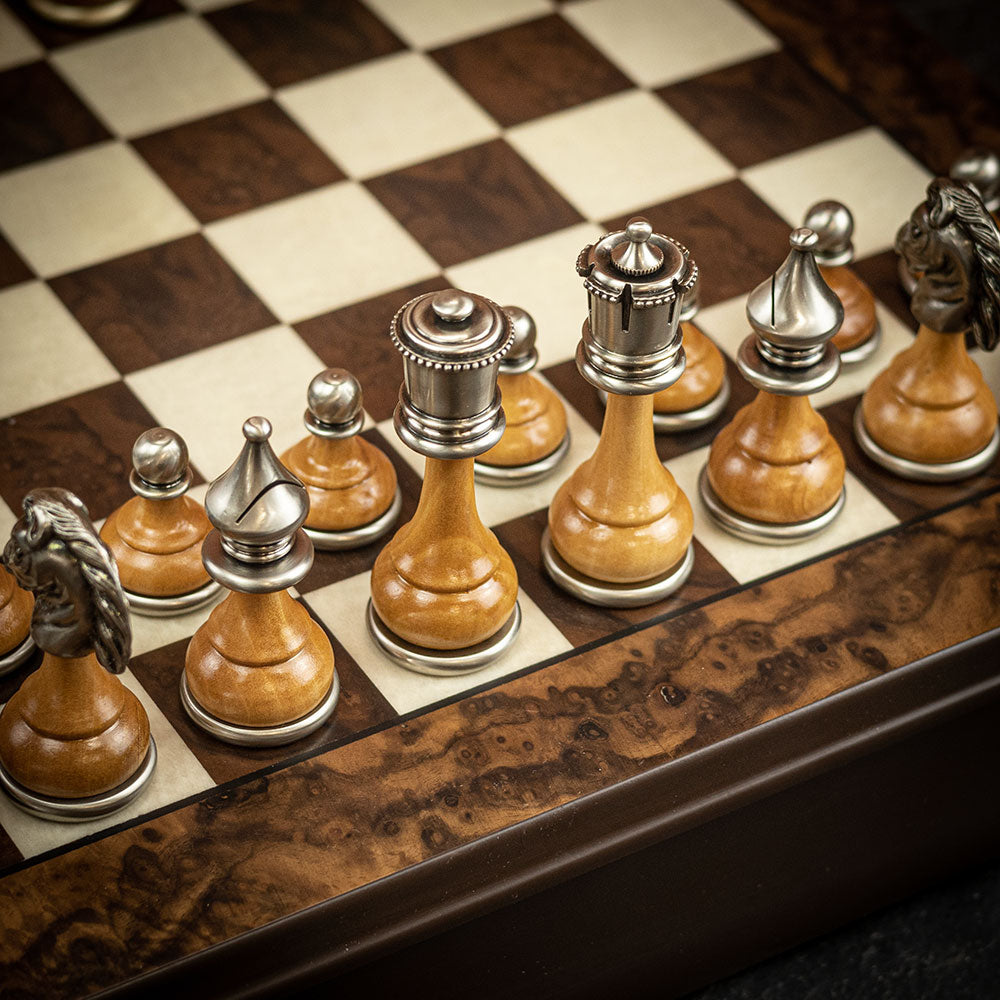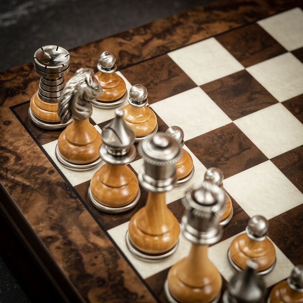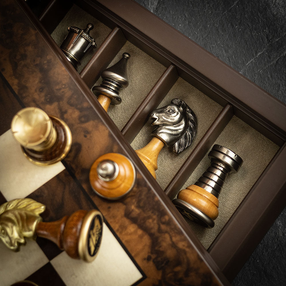 The board itself is walnut and maple, its squares veneered and sealed with a satin lacquer that softens the sheen without hiding the natural grain. Beneath the surface lies a storage compartment for increased organization and movement.