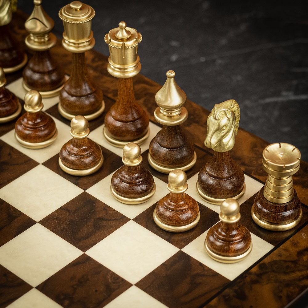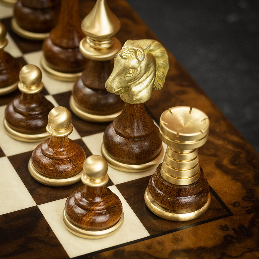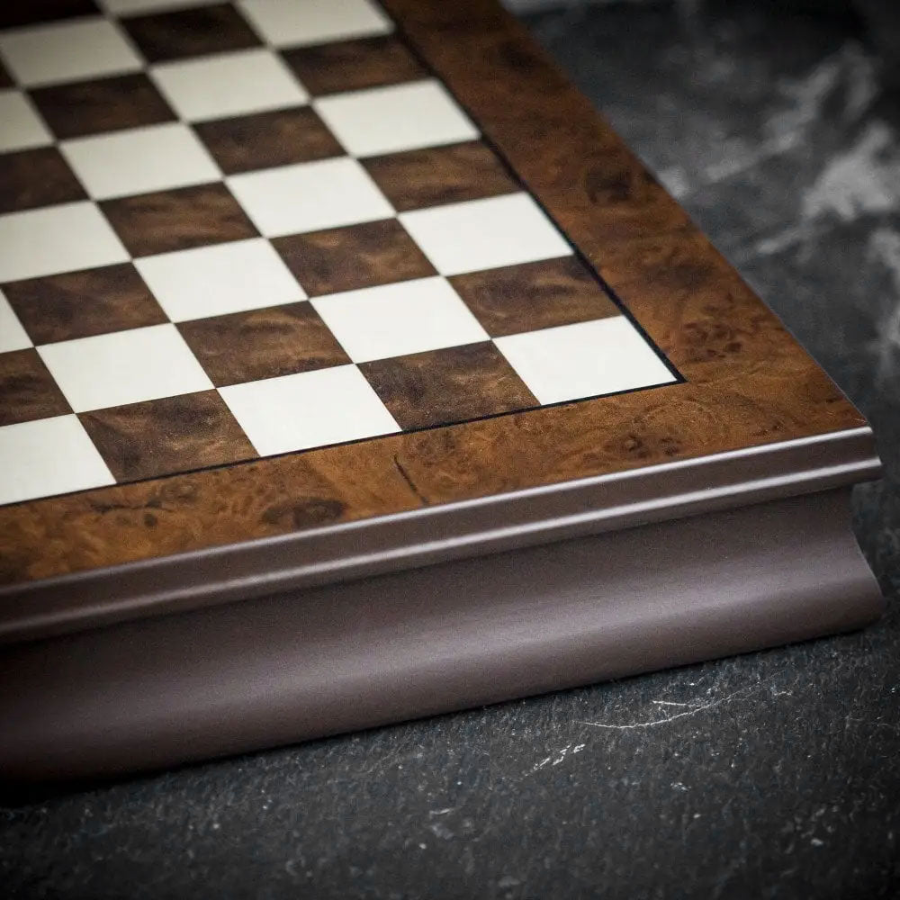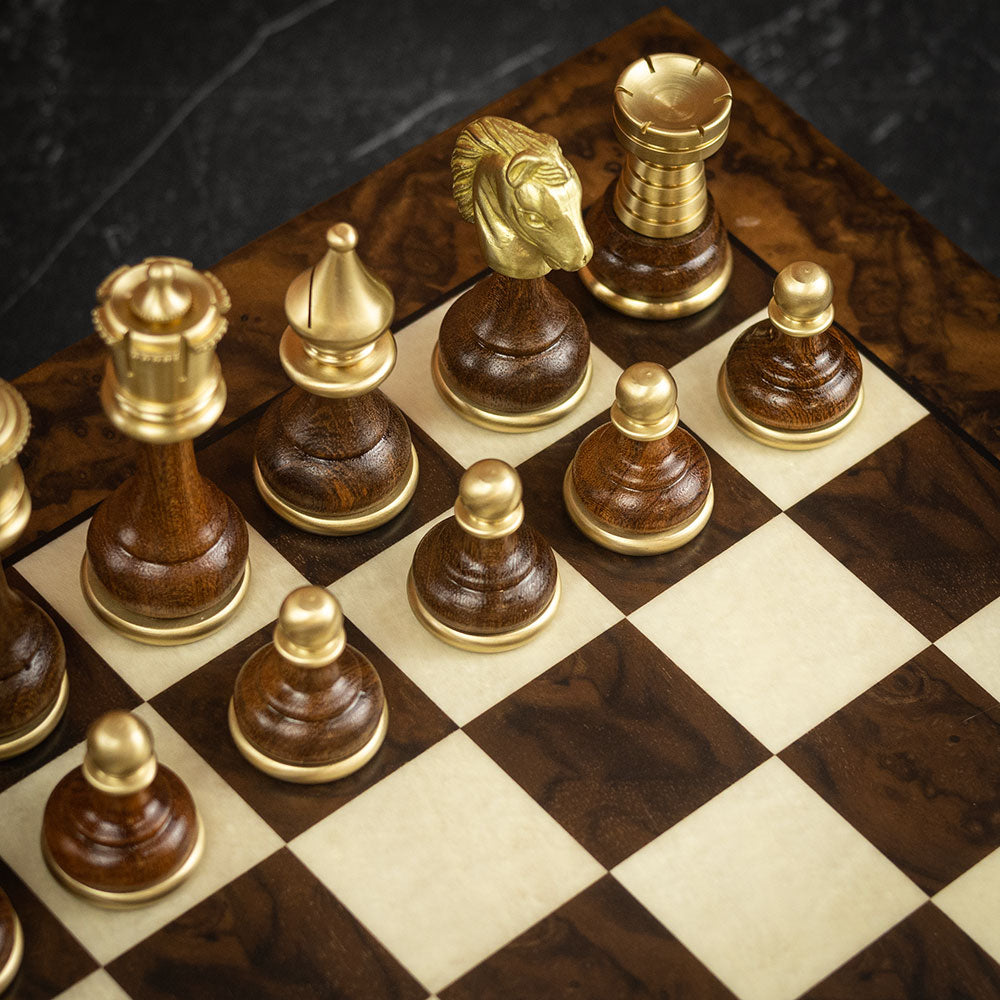 The board itself is walnut and maple, its squares veneered and sealed with a satin lacquer that softens the sheen without hiding the natural grain. Beneath the surface lies a storage compartment for increased organization and movement.