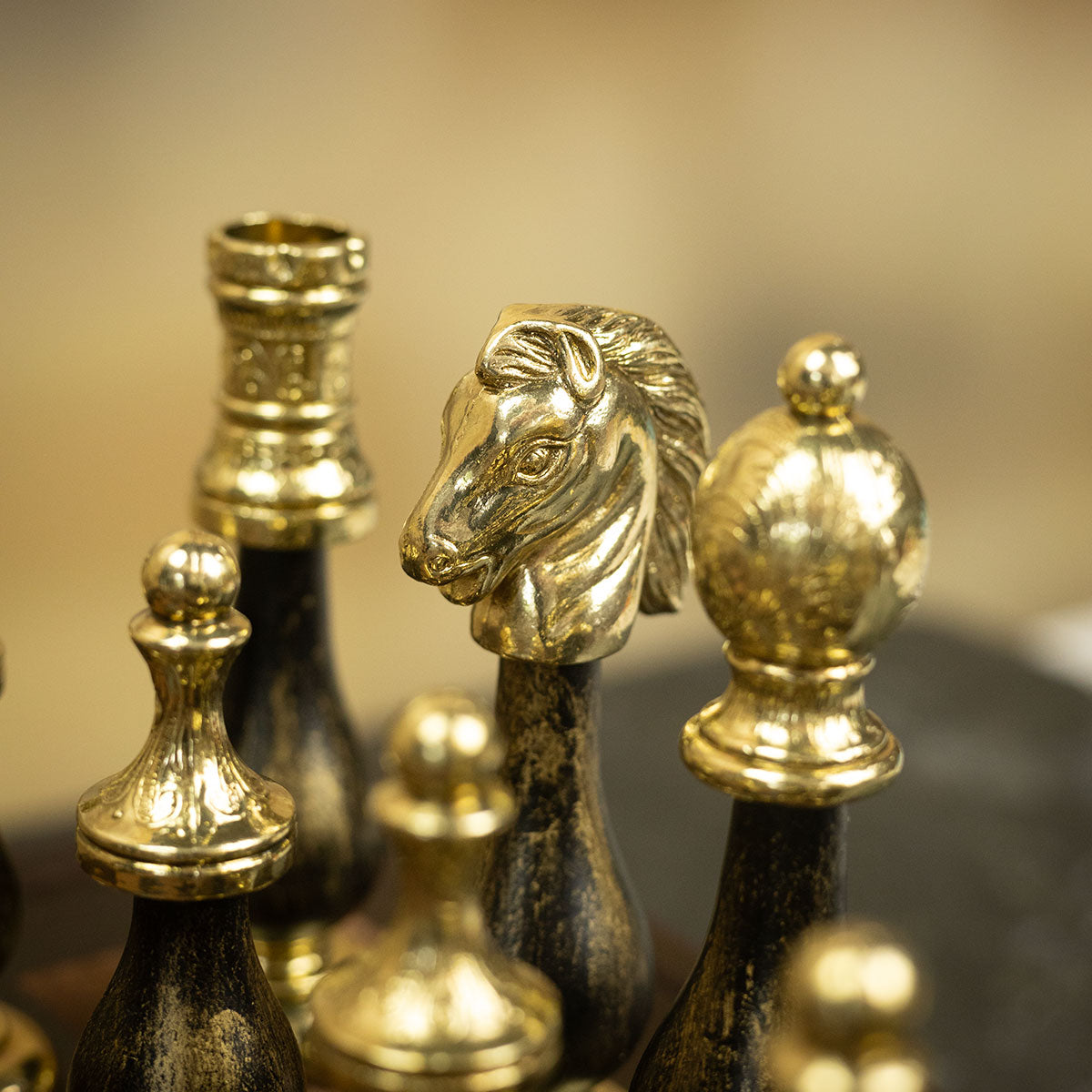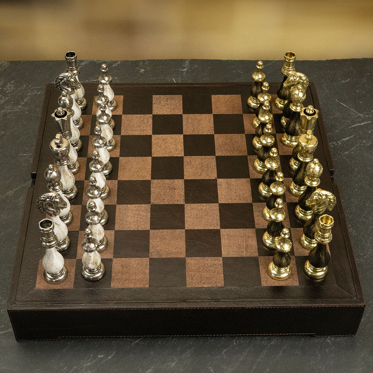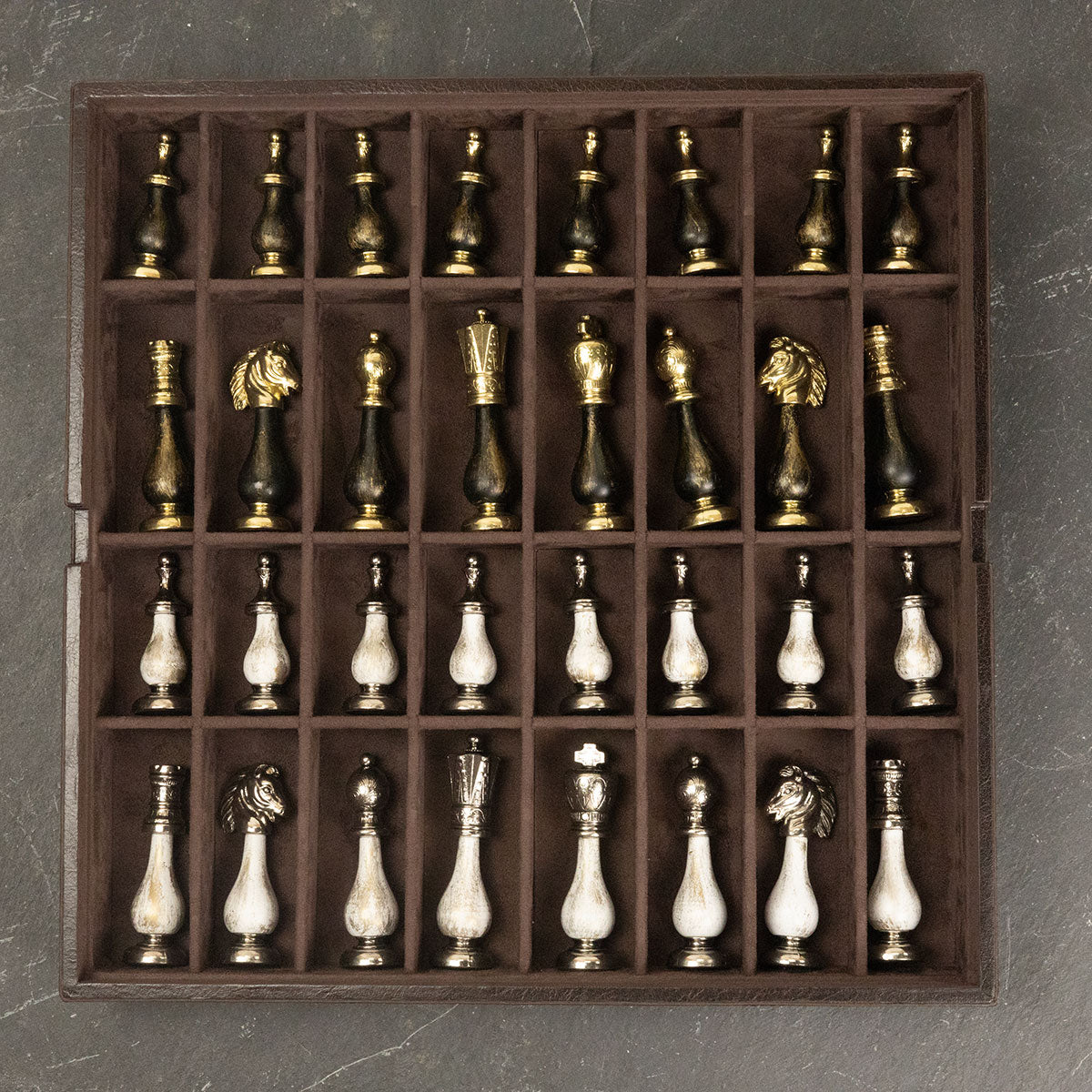 The chessboard is made from leather, giving it a supple, time-worn character that feels different from traditional wooden boards. The pieces are cast in brass, steel, and wood, which are all closely tied to ancient warfare and craftsmanship. Brass was prized for ornament and armor, while steel reshaped the battlefield in Alexander’s time. Wood was the workhorse.