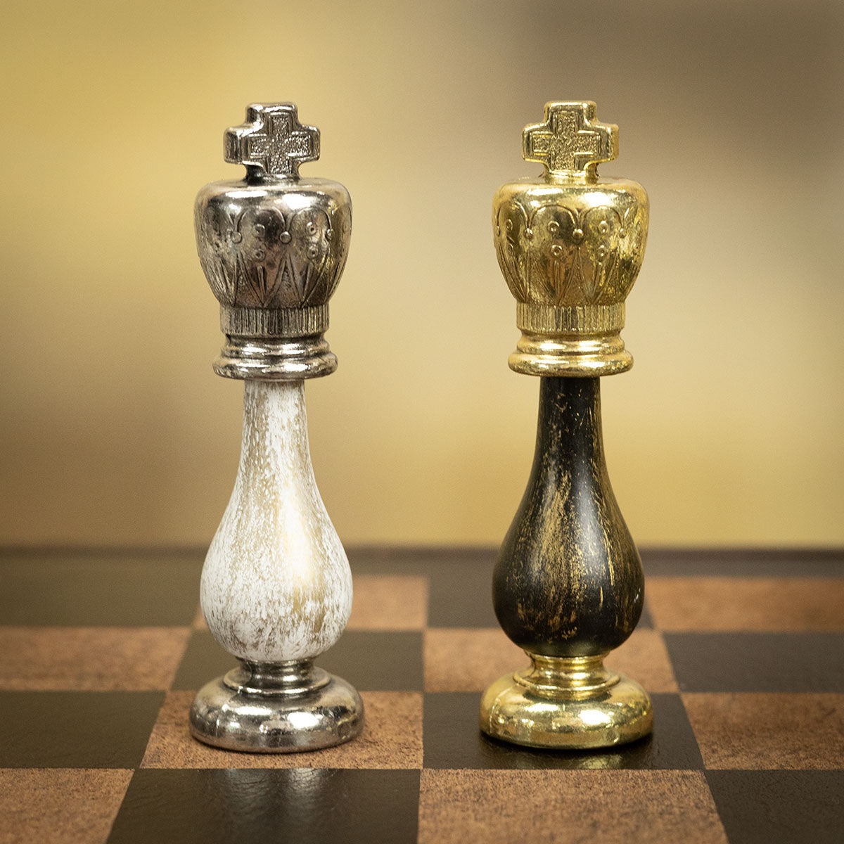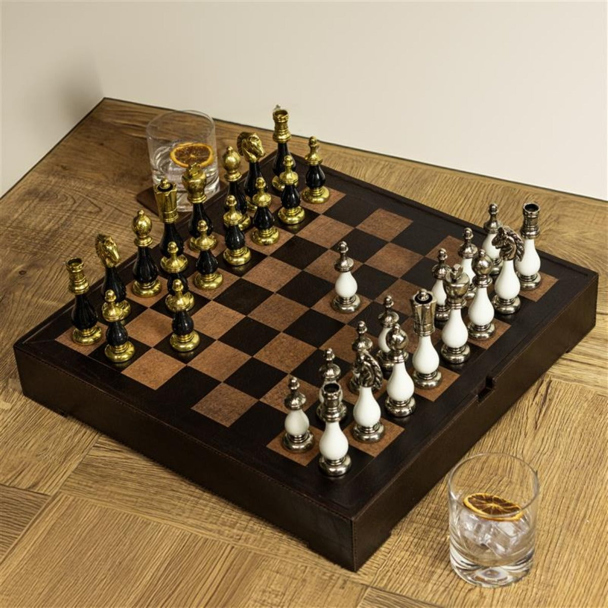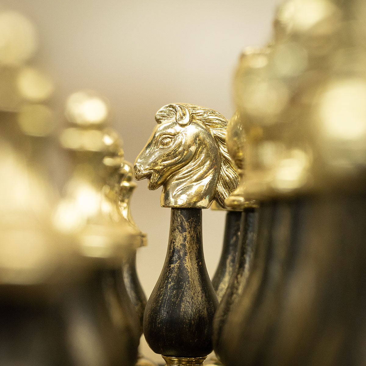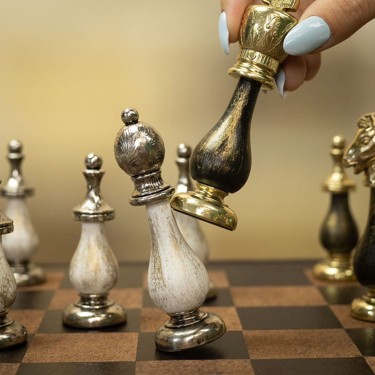 The chessboard is made from leather, giving it a supple, time-worn character that feels different from traditional wooden boards. The pieces are cast in brass, steel, and wood, which are all closely tied to ancient warfare and craftsmanship. Brass was prized for ornament and armor, while steel reshaped the battlefield in Alexander’s time. Wood was the workhorse.